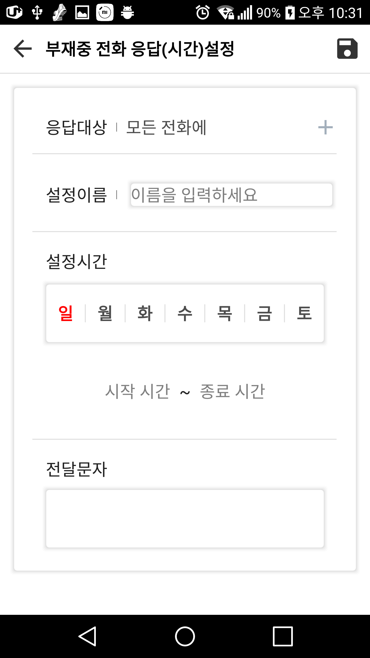 5. "부재중 전화 문자 응답(시간)" > 요일별 + 시간 설정을 하면 정해진 요일과 시간에 맞는 자동 응답 메시지를 전달 합니다.(중복 주의)